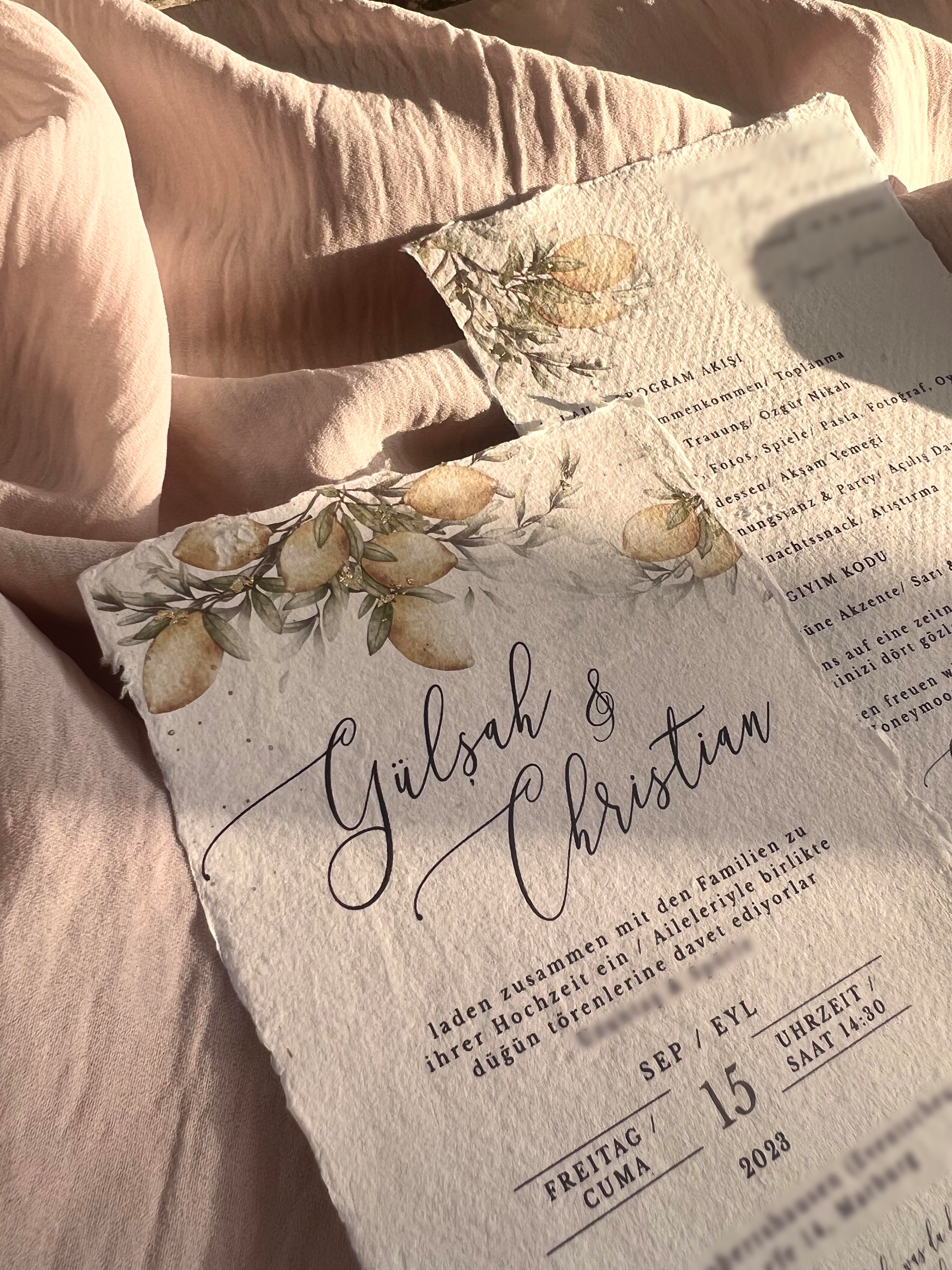 Bringen Sie mediterrane Leichtigkeit auf Ihren Hochzeitstisch – mit der „Love Lemons“ Einladung im lässigen DIN‑A6 Format (105 × 148 mm). Zitronenmotive in Aquarell-Optik wecken Vorfreude auf sonnige Tage und sorgen für Urlaubsvibes beim großen Tag.
