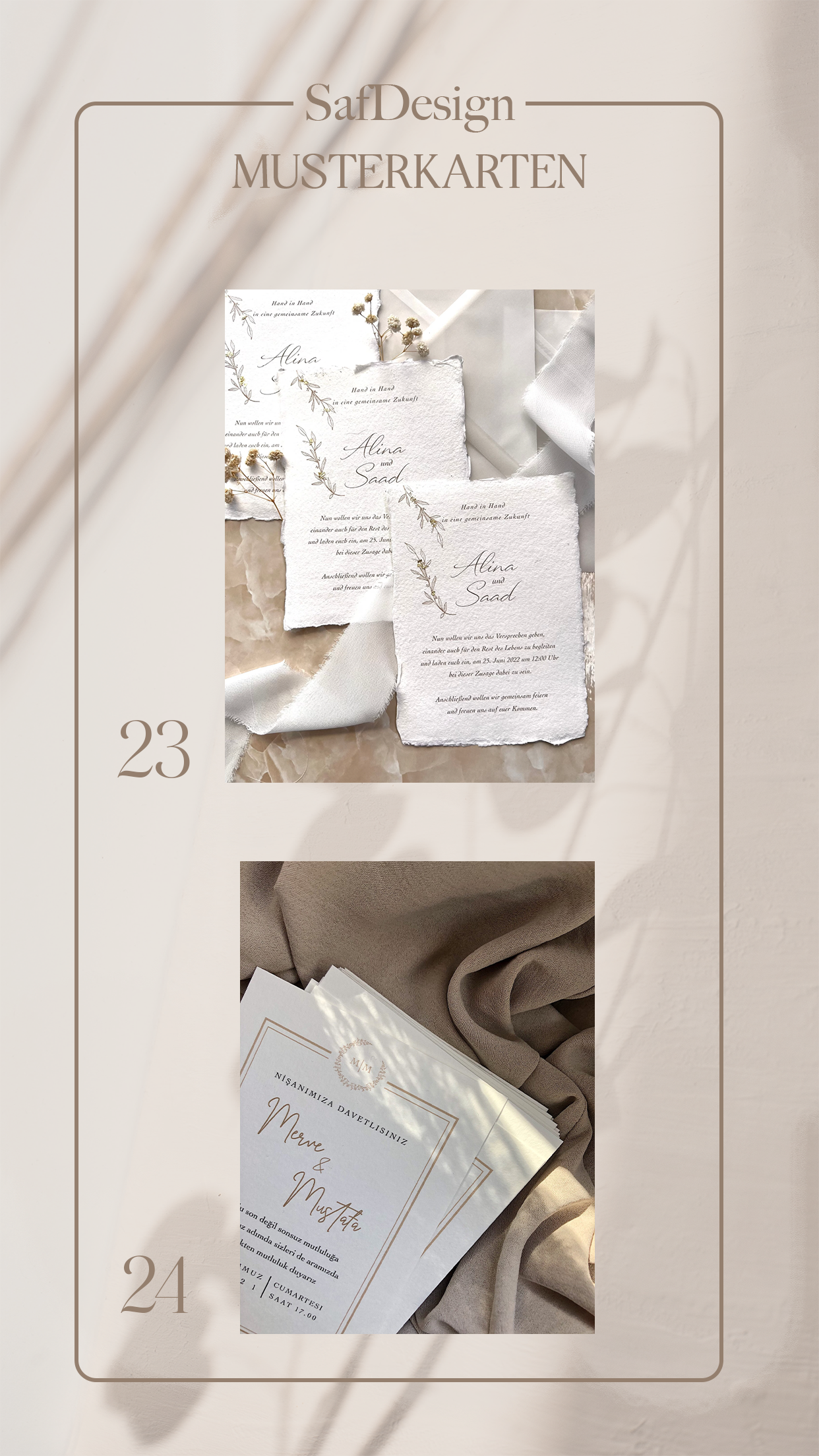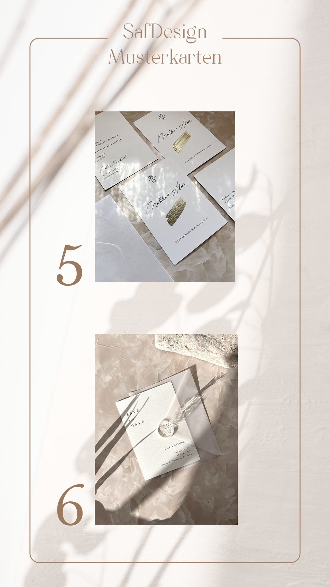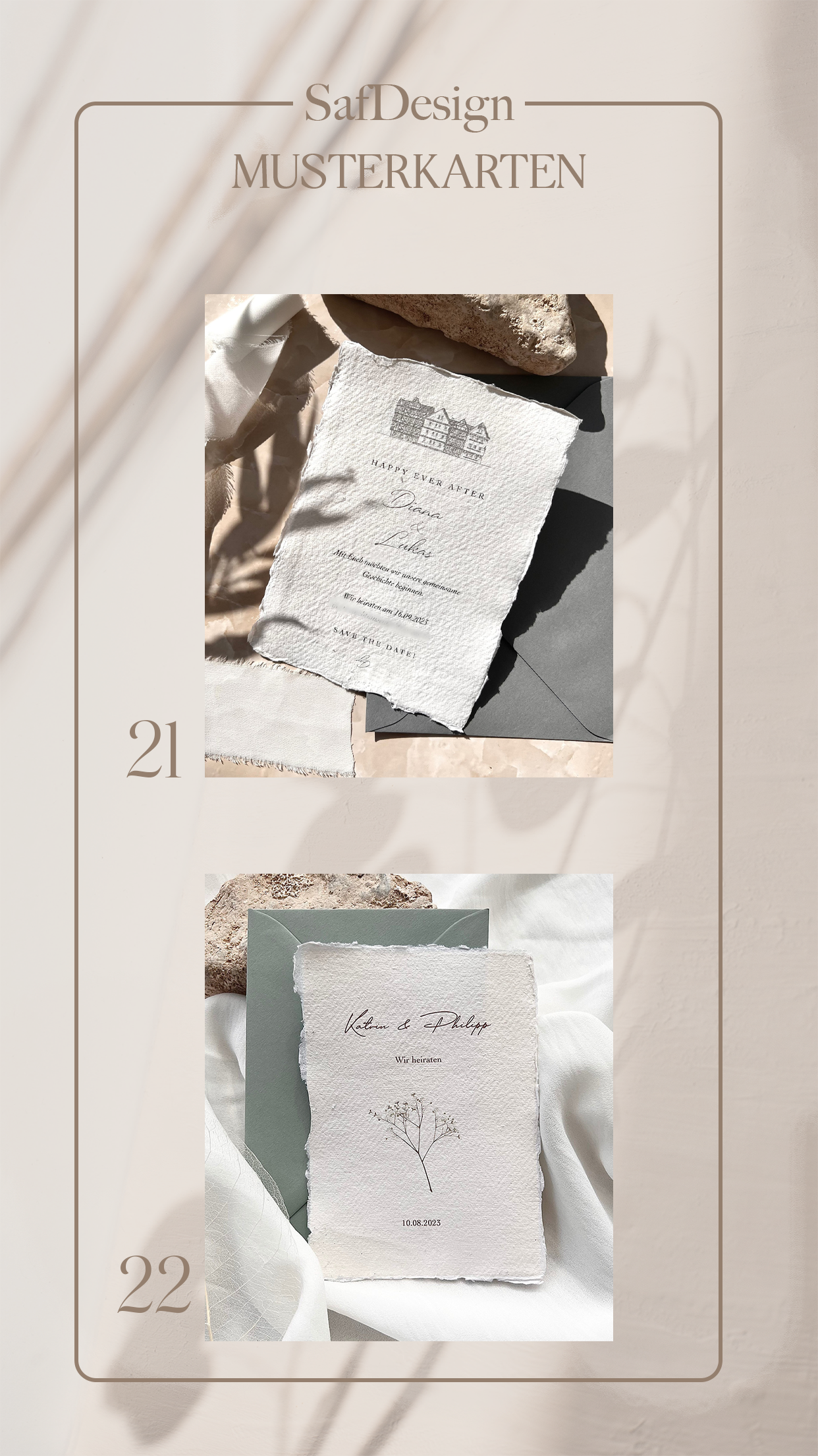 Erleben Sie die Qualität unserer Papeterie aus erster Hand: Die Musterkarte gibt Ihnen die Möglichkeit, Papierstruktur, Druck, Farben und Haptik in aller Ruhe zu Hause zu prüfen – bevor Sie sich für Ihr final gewünschtes Design entscheiden.