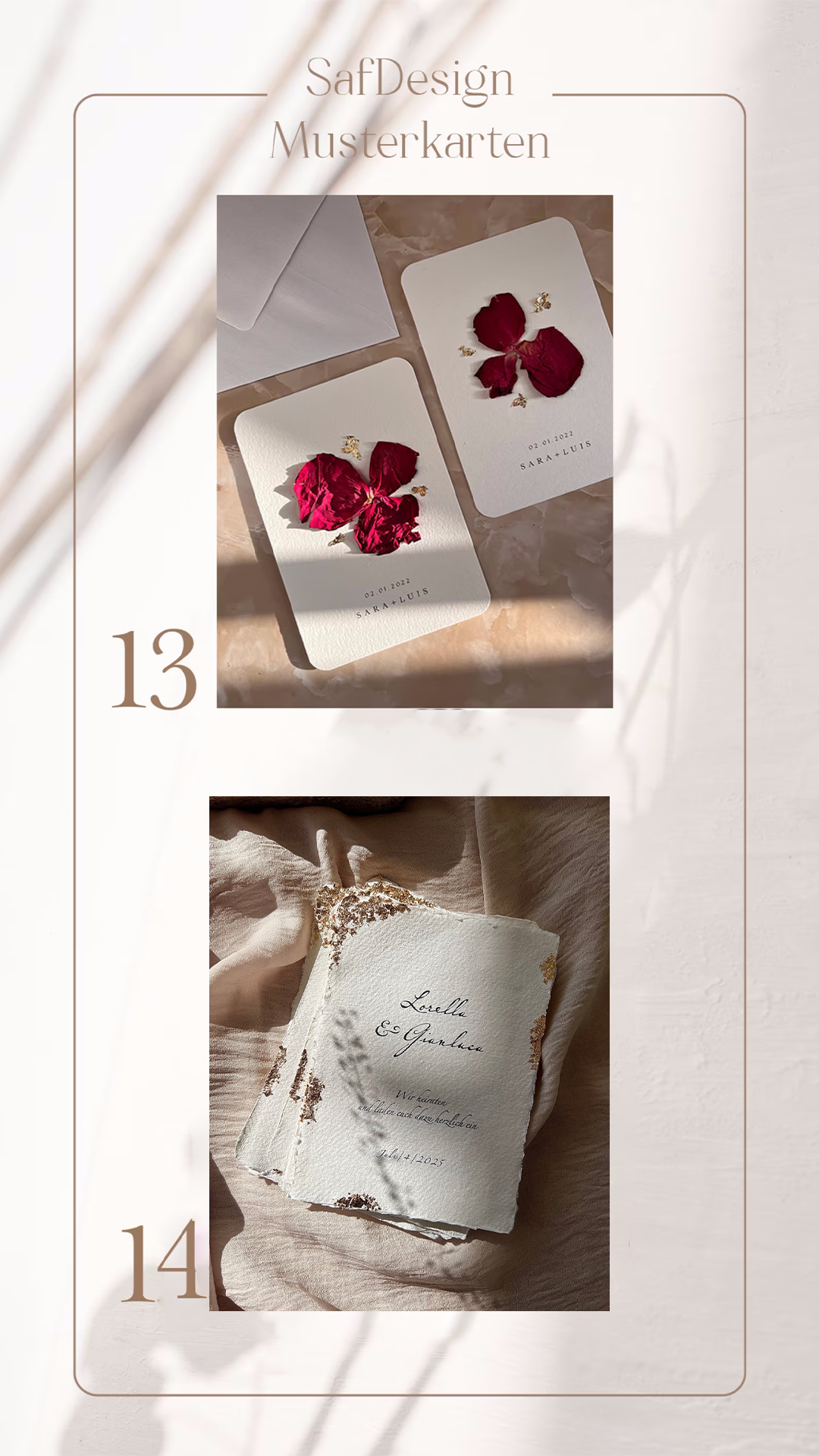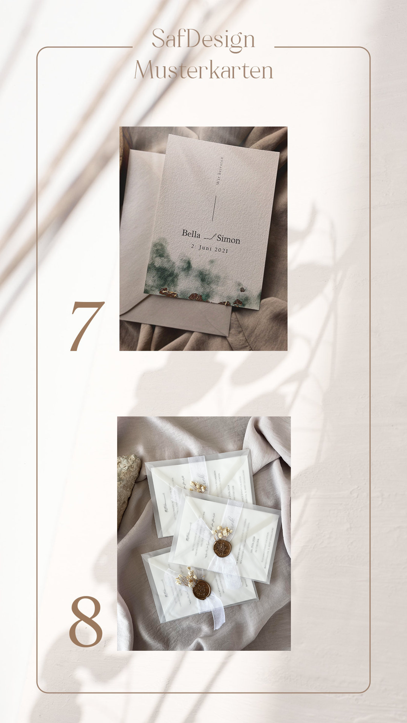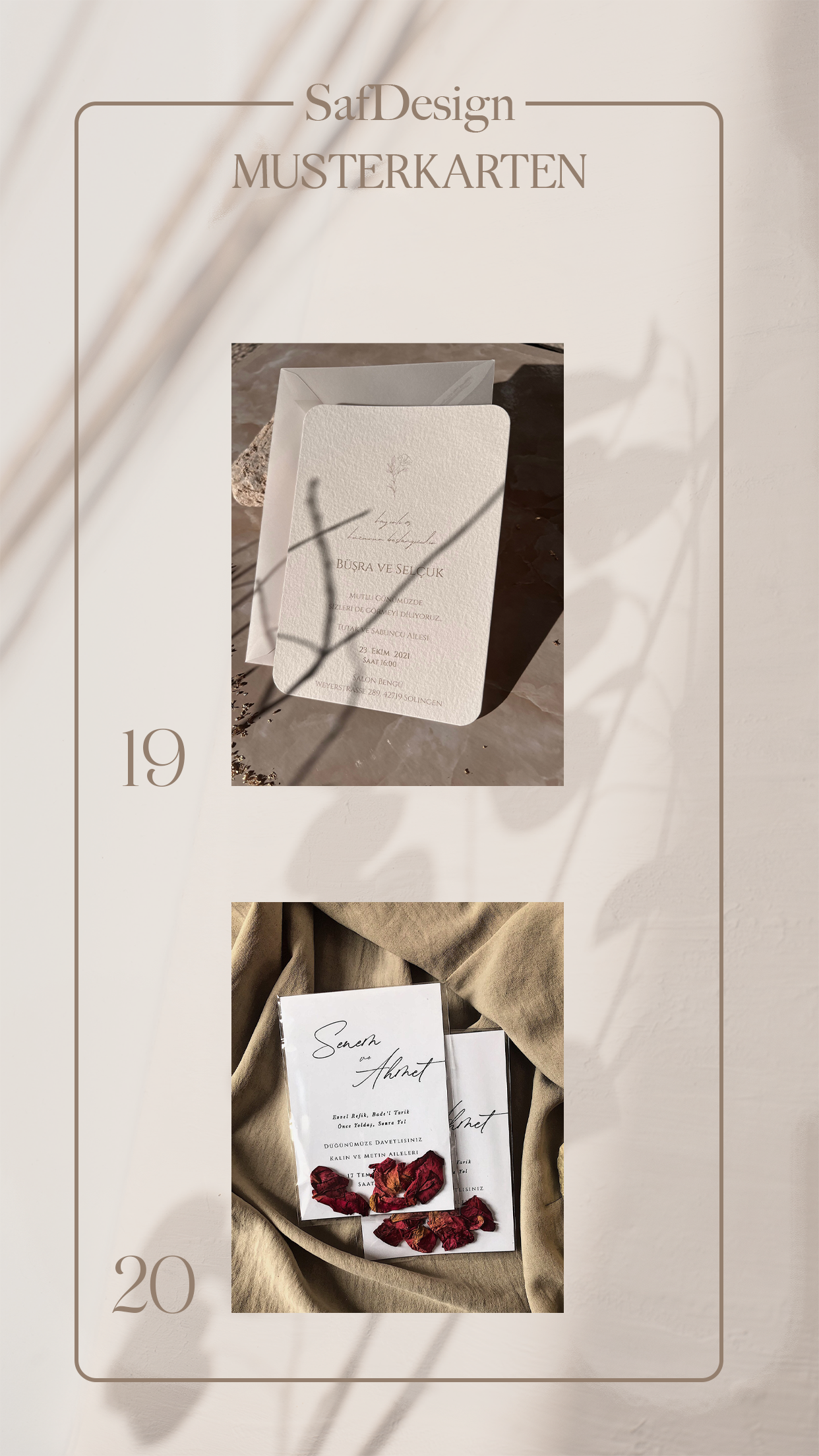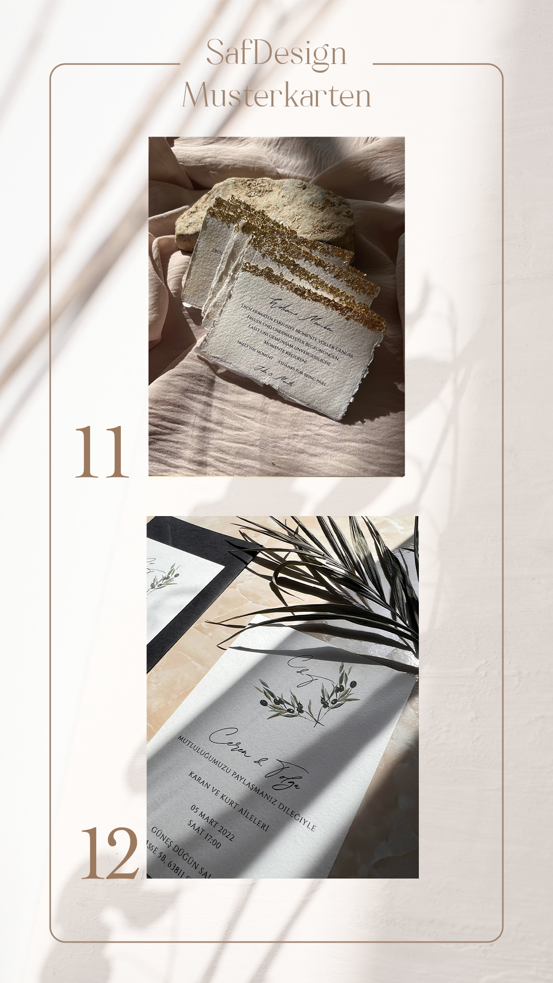 Erleben Sie die Qualität unserer Papeterie aus erster Hand: Die Musterkarte gibt Ihnen die Möglichkeit, Papierstruktur, Druck, Farben und Haptik in aller Ruhe zu Hause zu prüfen – bevor Sie sich für Ihr final gewünschtes Design entscheiden.