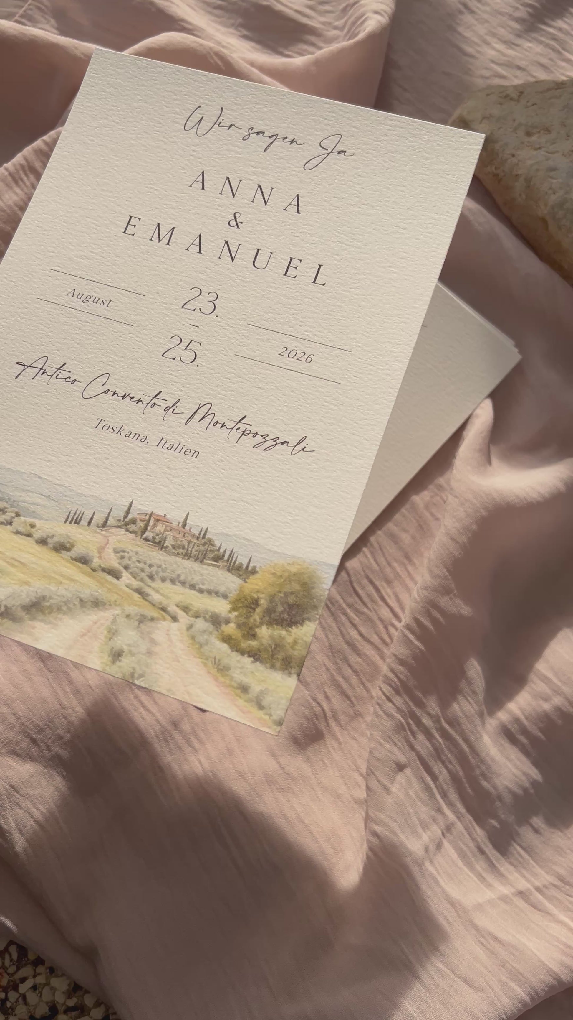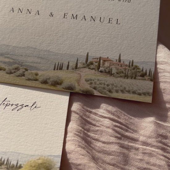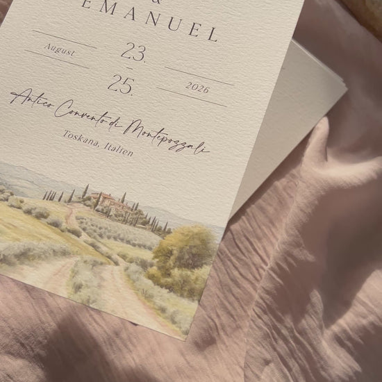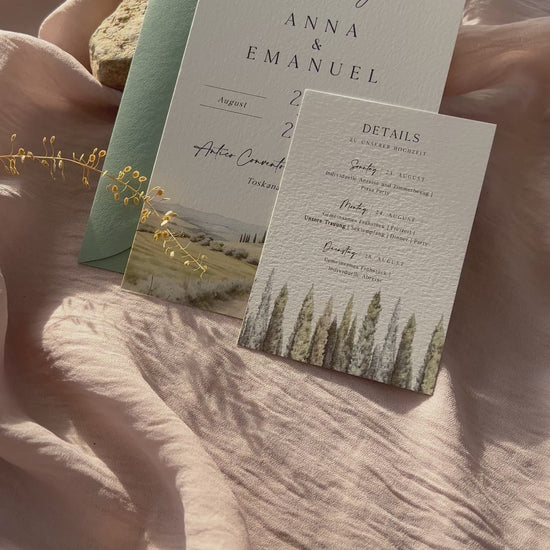 Unsere Einladungskarte „Hain & Hügel“ verbindet die Harmonie der Natur mit einer zarten, handgemalten Aquarelllandschaft. Sanfte Grüntöne, hügelige Silhouetten und ein ruhiger Hain verleihen dieser Karte eine warme, natürliche Atmosphäre.